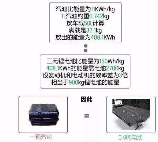 能量密度方面電池肯定不如汽油,但是究竟差別多大呢?一箱50L的汽油可以大概跑600km,續航同樣里程的電動車需要多少電池呢?(如下圖)