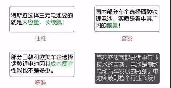 如果說國內把鋰電池的發展重心放在了磷酸鐵鋰電池上,國際動力鋰電池行業的新星非三元鋰電池莫屬,比鈷酸鋰電池更高的能量密度,成本低于鈷酸鋰電池,安全性也相當可靠。不同車企對于動力鋰電池的選擇都有自己的考慮(如下圖)如果說國內把鋰電池的發展重心放在了磷酸鐵鋰電池上,國際動力鋰電池行業的新星非三元鋰電池莫屬,比鈷酸鋰電池更高的能量密度,成本低于鈷酸鋰電池,安全性也相當可靠。不同車企對于動力鋰電池的選擇都有自己的考慮(如下圖)